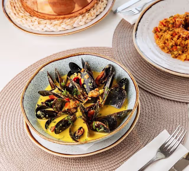 - Mexilhões servidos num molho cremoso de açafrão com um leve toque de picante, alho e ervas aromáticas.