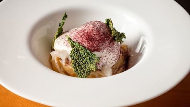 - Spaghettone quadrato, crudo di gambero rosso, burro acido, peperone, pimenton