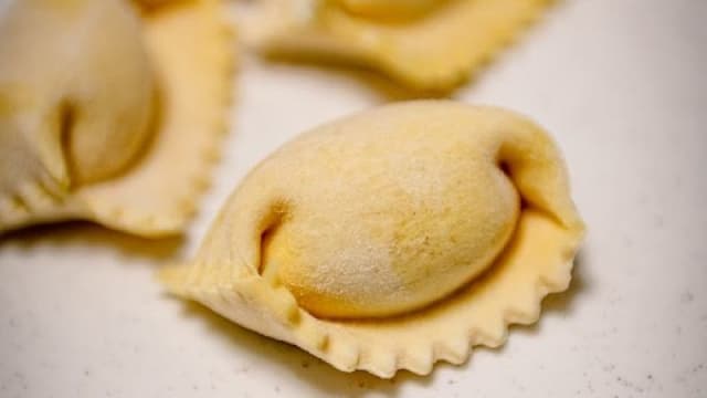 - Tortello di anatra, arancia, aneto, crudo di scampi