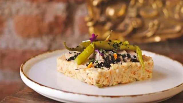 Ensaladilla rusa con ventresca, piparras y polvo de aceituna negra