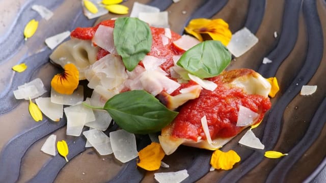 Gyoza ripieno di carne, sugo all’amatriciana e guanciale per un gusto intenso