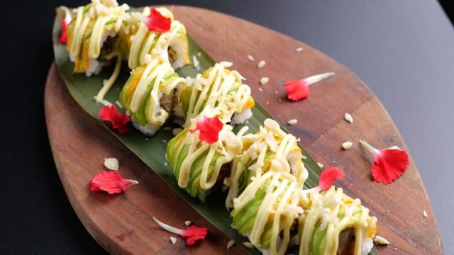 Il classico della cucina romana in versione sushi: guanciale croccante, uovo, pecorino, parmigiano e pepe avvolti in un roll irresistibile