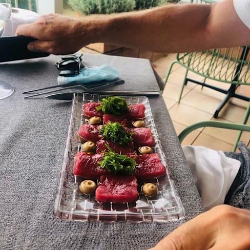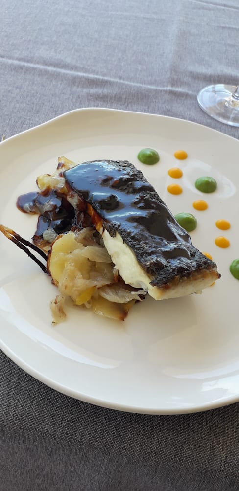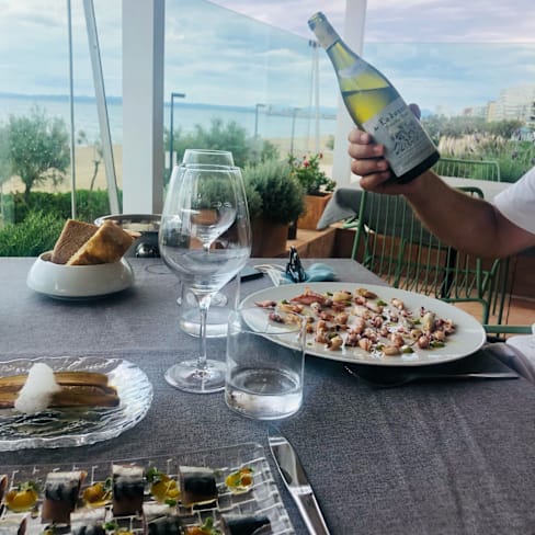 8/10The restaurant is in a beautiful location, right on the beach. It has two floors with terrace seating on the ground and upper level. The decor is modern, neutral with earthy tones, a fine dining experience. The service is fabulous. We were greeted promptly and seated just as quickly. We do not speak good Spanish but the waitstaff all delivered in fine English. We ordered a variety of food. First was the bluefin tartar, which was beautifully presented. The fish was extremely fresh but the flavor was lacking a wow factor needed for 22€. Next we had barbecue octopus. It was not the best presentation (kind of looked like someone threw up on a plate). But the cook on the octopus was perfect and it was very flavorful. For our mains we had ibérico pork and bacalao (cod). The pork was very good, seasoned well, but a little over cooked and a bit underwhelming. I wanted more. The cod was unfortunately a big let down. There was a small piece of cod that was swallowed up by an overwhelming amount of cream sauce. Good flavor but next time I want more fish than sauce. Our desserts were great, so it was a good finish. In my opinion, you are paying a premium for a fine dining experience on the beach, but one that just missed the mark for commanding such a premium. You won’t be disappointed by the service and the venue, but the food falls short.