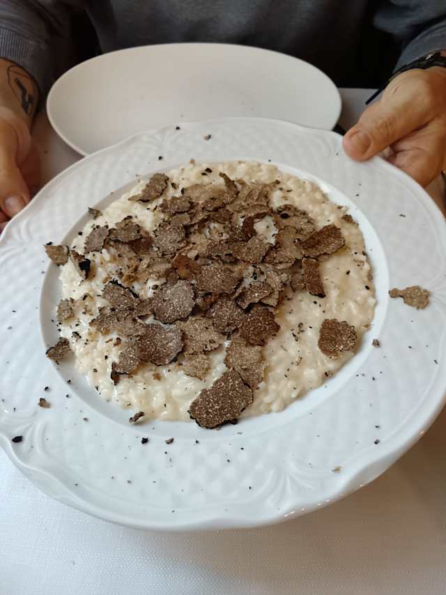 - Risotto carnaroli con funghi porcini trifolati, castagne sbriciolate, crema di castagne e timo fresco