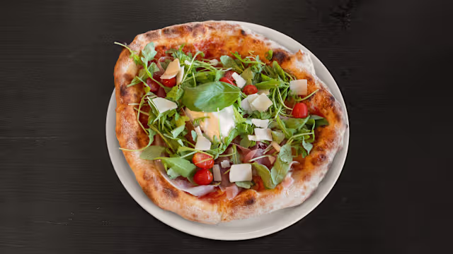 - Sauce tomate, mozzarella fior di latte, champignons, jambon blanc, basilic