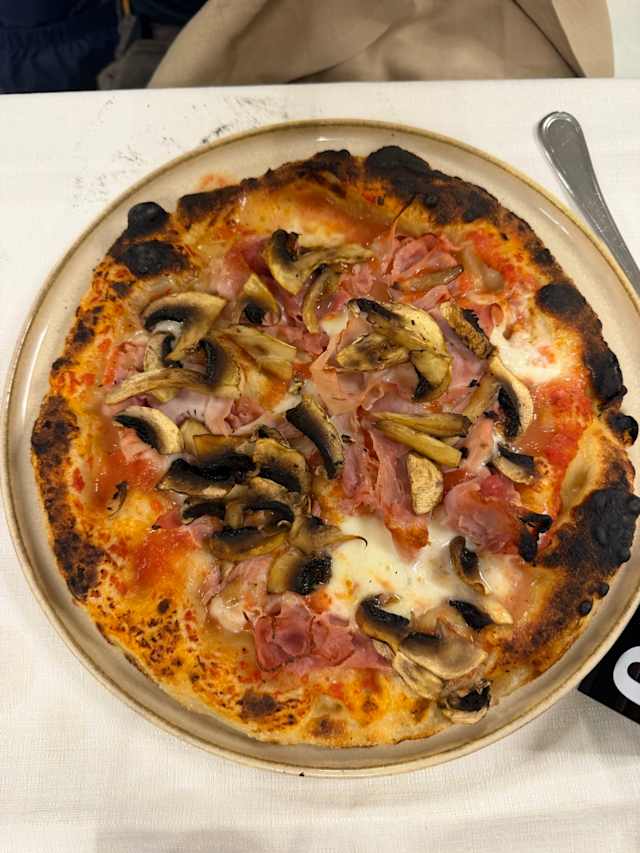 - Pomodoro, mozzarella, prosciutto, funghi, olive e salamino