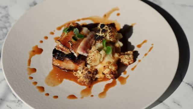 Potato mousseline-green apple spaarndammer eel-cauliflower-soy/fennel seed gravey