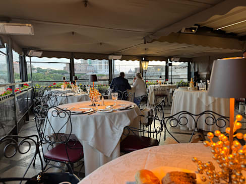 7/10This restaurant has a pretty, old-fashioned interior with a retro-Italian vibe. Service was okay. The quality of food is good, however the taste itself is average - you don’t need to expect an unforgettable gastronomic adventure here. As for the view, it’s great, but I highly recommend to come for a dinner rather than in the evening, as the restaurant’s halls do have a lot of lights so their reflection in windows makes it more difficult to see something outside.
