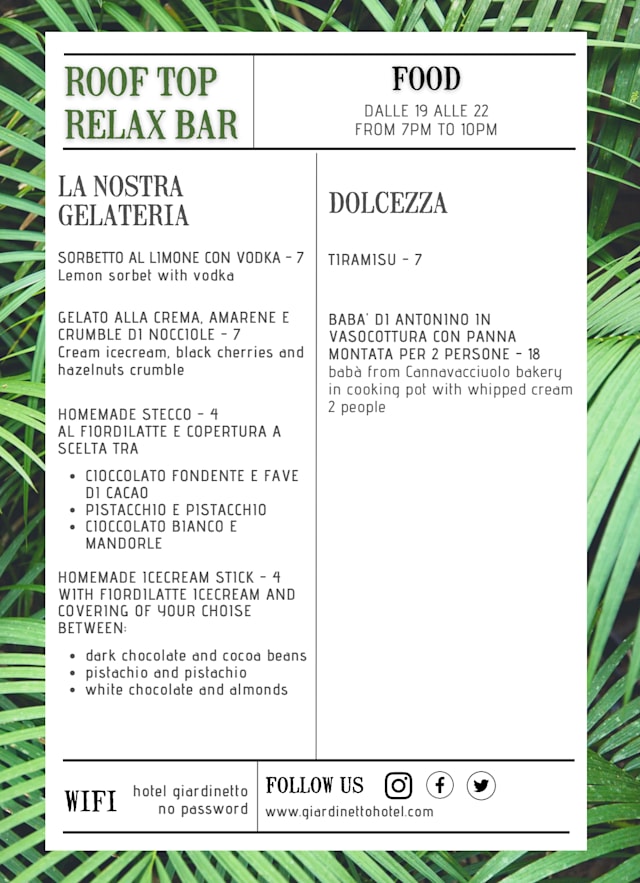 If you plan to eat at Roof Top Relax Bar, the average price should be around €30. The average price is calculated based on appetizer/entrée or entrée/dessert, excluding drinks. Prices have been provided by the restaurant.