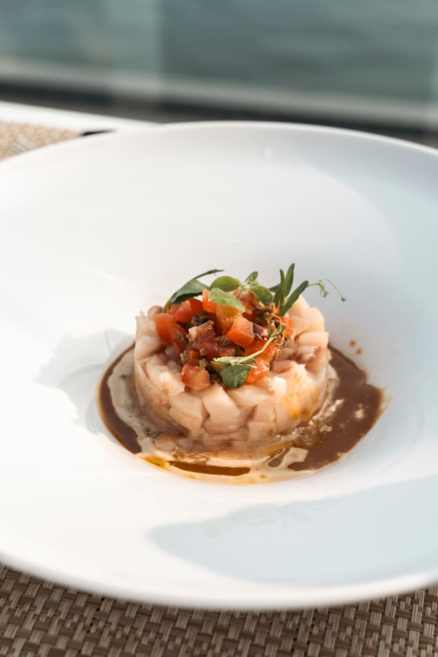 Tartare di ricciola, dressing al frutto della passione, battuto di olive, pomodorini e capperi