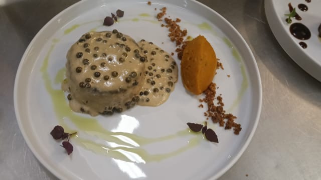 - Carpaccio di scottona con salsa bernese, pesto di rucola e nocciole tostate, croccante al pepe verde