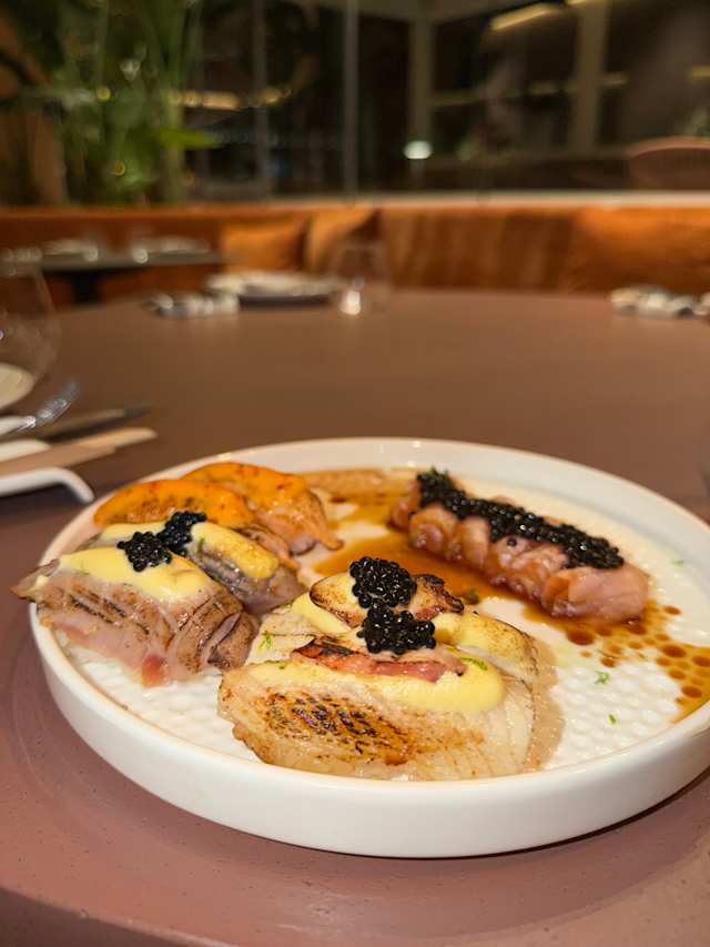 - Gambero in tempura, mango topping: ricciola scottato, maionese, perle di yuzu, zeste di lime