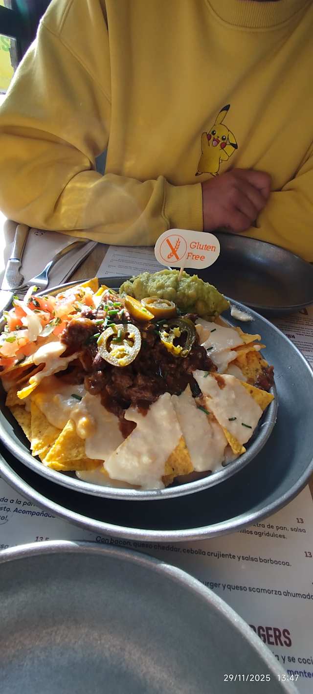 - Totopos de maíz bañados en nuestra salsa casera de tres quesos, chili con carne, guacamole y pico de gallo