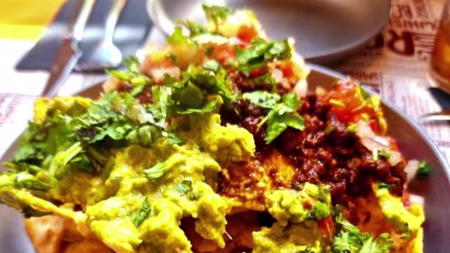 - Totopos de maíz bañados en nuestra salsa casera de tres quesos, chili con carne, guacamole, pico de gallo yjalapeños