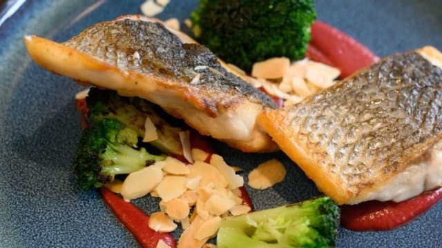 Pavé di branzino su crema tiepida di fave con cetriolo in osmosi e mandorle tostate