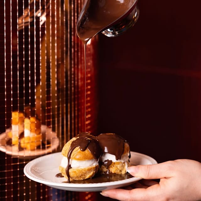 Choux, glace vanille maison, sauce chocolat noir.