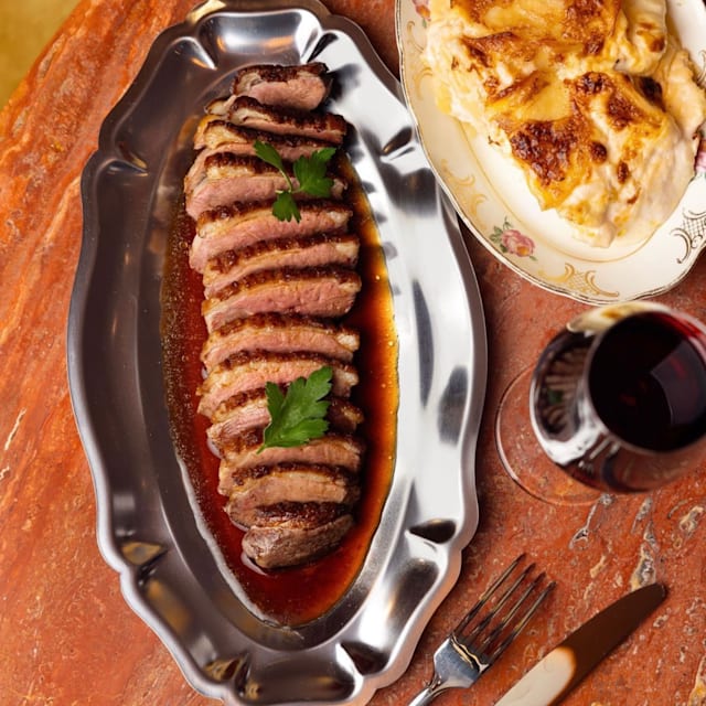 Canard fermier label rouge du sud-ouest IGP, sauce au miel, jus réduit et un gratin dauphinois ultra-crémeux.