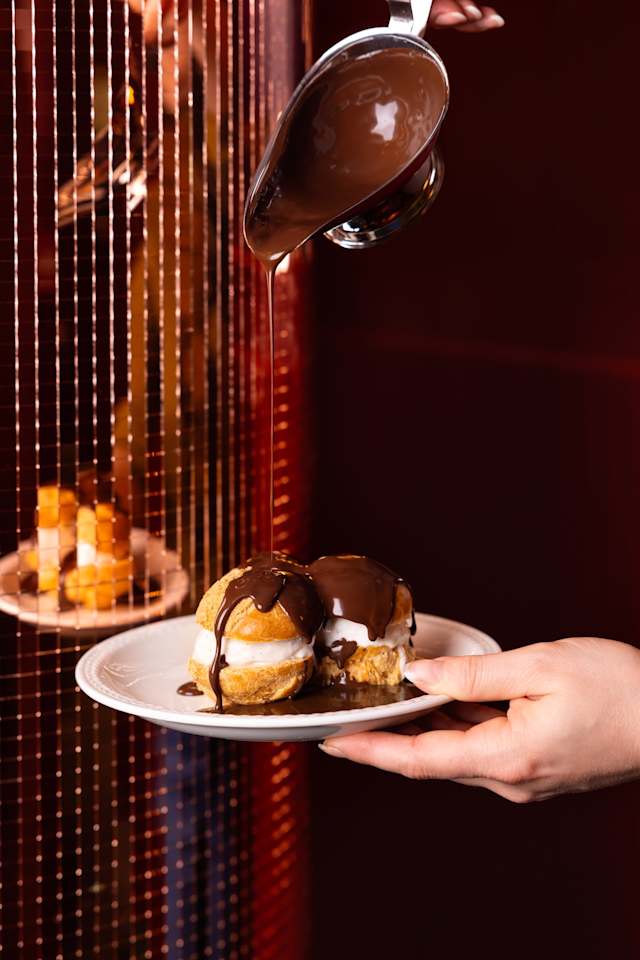 - Chou gourmand et croquant, crème pralinée, éclats de noisettes.
