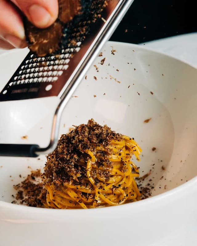 CHITARRA ALL’AGLIO NERO FERMENTATO, VENTRICINA TERAMANA E COULIS DI AGLIO ORSINO