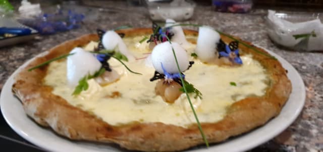 Crème au parmisan, mozzarella di bufala, capesante* saltate, dadolata di mango caramellato, sale nero, soufflé di patate al nero di seppia, fiore commestibile di stagione, prezzemolo