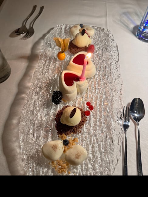 10/10The whole experience was wonderful. We had a table overlooking the lake, we were given a complimentary glass of bubbles on our arrival. The menu was unusual and very clearly laid out for me who suffers from a gluten intolerance. We felt like we received 5 star treatment and the desserts were stunning. All in all 5 star 🌟