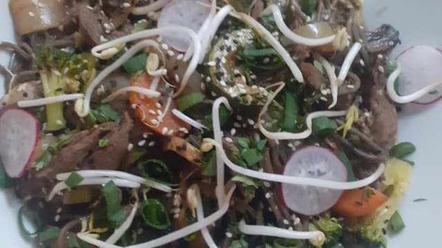- Boeuf ou poulet ou crevettes ou oeuf/tofu,nouilles soba ou riz, légumes, sauce teriaky ou basilic thaï ou coco curry vert
