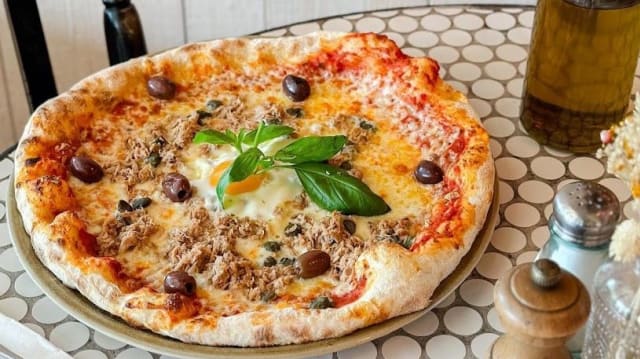 Crème de pesto vert, mozzarella, poulet crispy, champignons, chèvre, olives