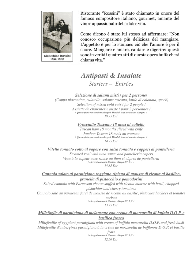 10/10Rossini was recommended to me by a friend who had eaten there the previous week. As we had eaten a large lunch, we only had pizzas with salad and they were delicious. The restaurant was full and the atmosphere was great. Staff are very friendly and available.