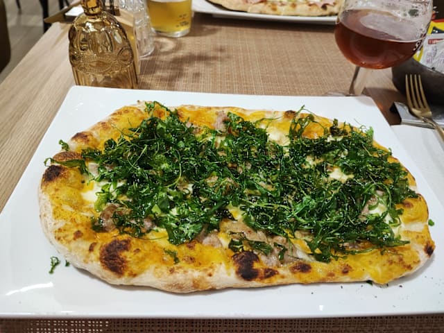 Fior di latte pugliese, salsicia fresca, bacon, in uscita crema di formaggi, prezemolo, pepe rosa, olio evo