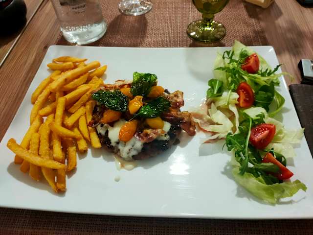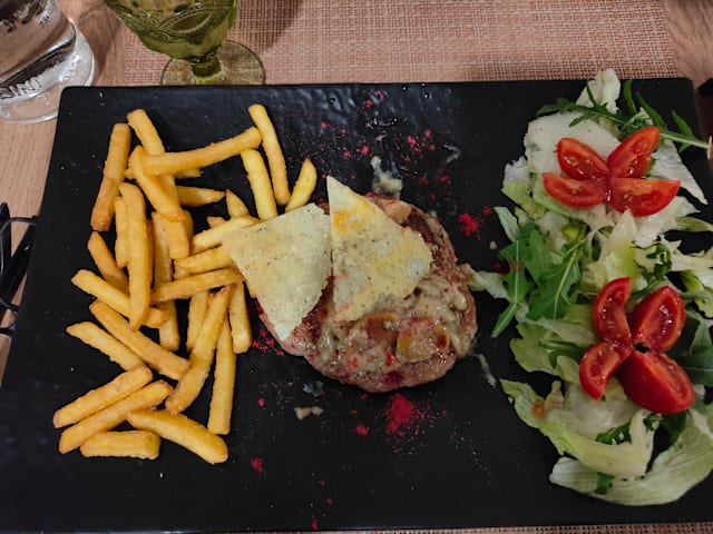 Hamburger di scottona 300gr al piato con capcollo croccante, fonduta di gorgonzola, cipolla caramellata ruccola fritte e tarallo sbriciolato, accompagnato da misticanza, pomodorini e stick di patate fritte croccanti