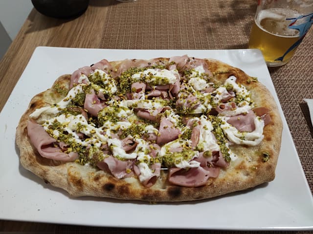 Fior di latte pugliese, prosciutto cotto, ricotta , in uscita rucola, crema di noci, scaglie di grana padano, sale, pepe, olio EVO