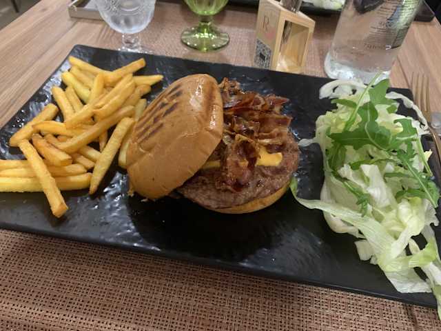 Hamburger di scottona 300gr al piatto, con fonduta di formaggio cheddar, bacon croccante, accompagnato da misticanza, pomodorini e stik di patatine fritte croccanti