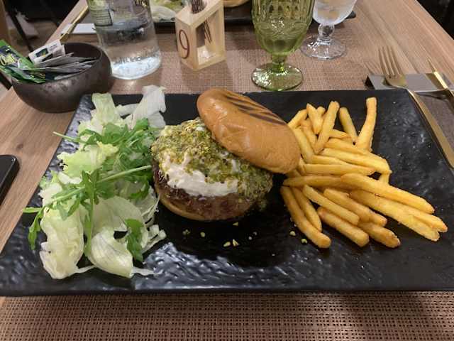 Hamburger di scottona 300gr al piatto, crema di pistacchio, stracciatella e granella di pistacchi, accompagnato da misticanza, pomodorini e stick di patatine fritte croccanti