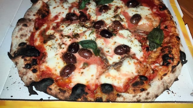Base margherita con salame piccante, carciofini in olio evo, prosciutto cotto affumicato, funghi freschi, olive perenzane