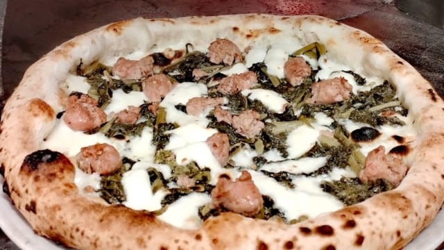 Fior di latte km 0, friarielli campani saltati in padella, salsiccia di maiale a punta di coltello, scaglie di peperoncino, sale, olio evo.