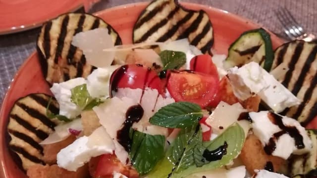Salsa di pomodoro san marzano DOP, fior di latte km 0, verdurine grigliate condite con olio evo, sale, menta.