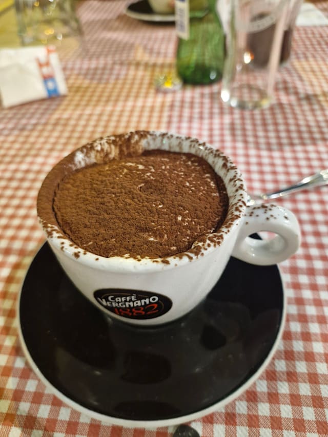 Tiramisù con biscotti savoiardi bagnati al caffè, crema di mascarpone e cacao