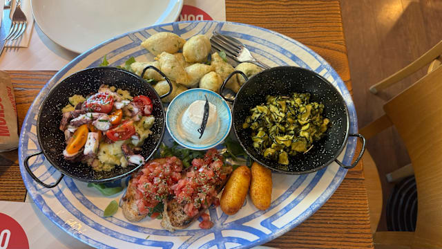 bruschette con pomodoro ramato, aglio e origano - polpo e patate - ricotta di bufala dsale e pepe -crocchè salame e provola affumicata - zucchine alla scapece - zeppoline alle alghe