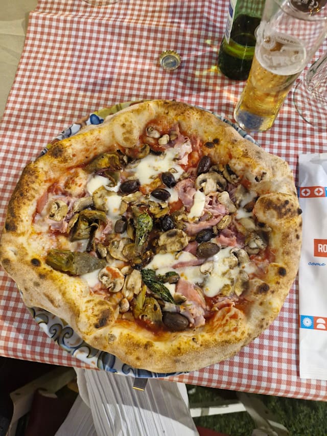 Pelati rossopomodoro, mozzarella fior di latte, funghi champignon, prosciutto cotto granterre, carciofini e olive