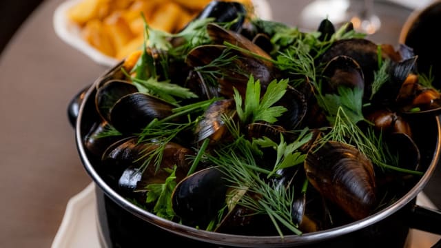 - Mussels, white wine, fresh garden herbs, cream, fries