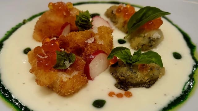 Tempura di gamberi al nero di seppia con spuma alla mozzarella di bufala e riduzione di pomodorini
