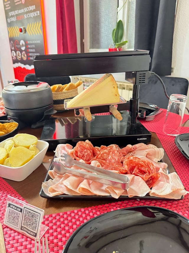 Formaggio (raclette) da fondere su affettati misti accompagnati da sott'aceti, affettati e patate lesse. Minimo 2 persone