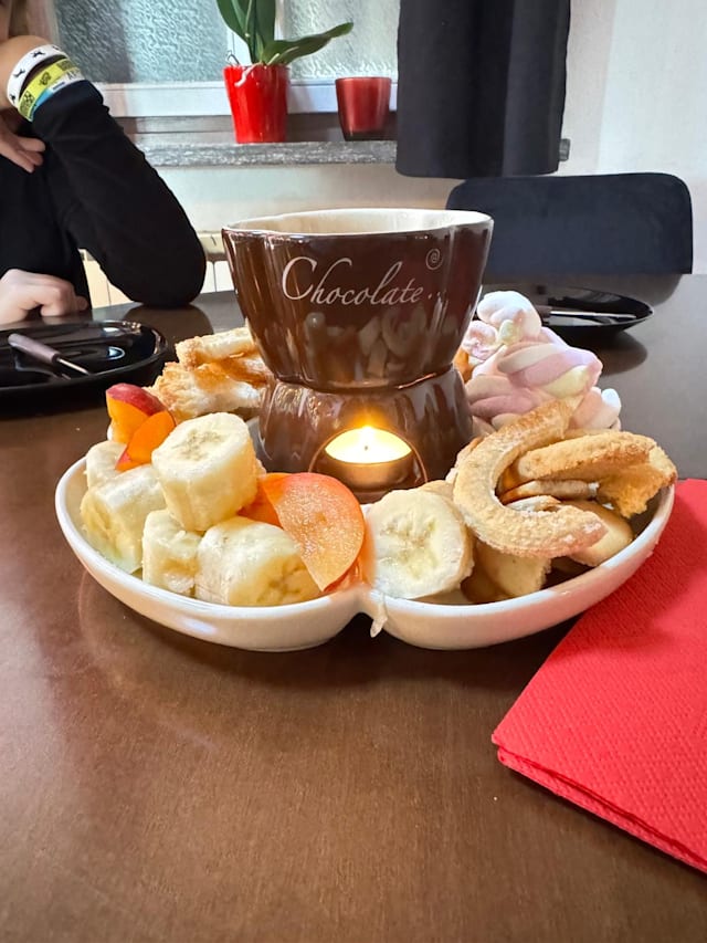 Cubetti di carne mista di vitello, pollo, maiale e salsiccia da cuocere nell'olio / vino rosso. Accompagnati da patatine fritte e svariate salse. Minimo 2 persone