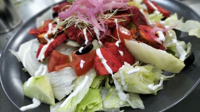 Tipico hindú, pollo cebolla, tomate, pepino y cilantro