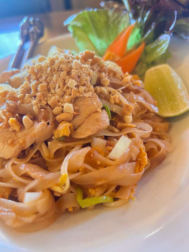 - Fideos transparentes con pollo picado, langostinos, cilantro, cebolla china y tomate cherry