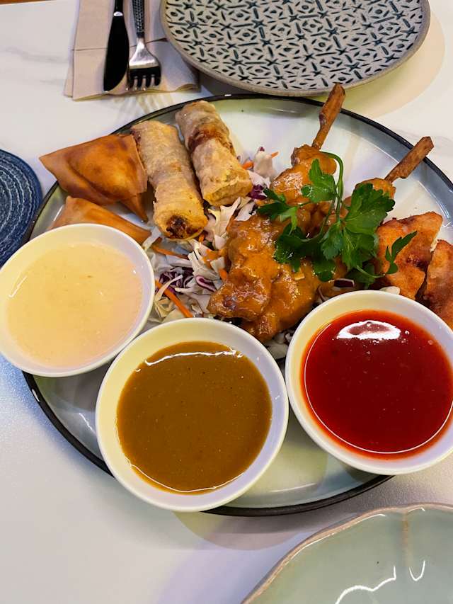 - 2 pinchitos de pollo, 2 gong hom pha, 2 phophia thod
