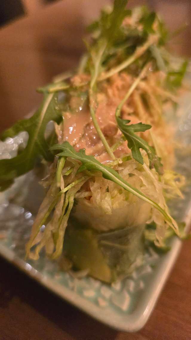- Rollitosfrescos de gamba, rúcala, hierbabuena, cilantro, sésamo, verduras y aguacate