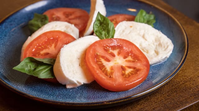Tomate, mozzarella, mortedella con pistacho, burrata, pesto de pistacho, granella