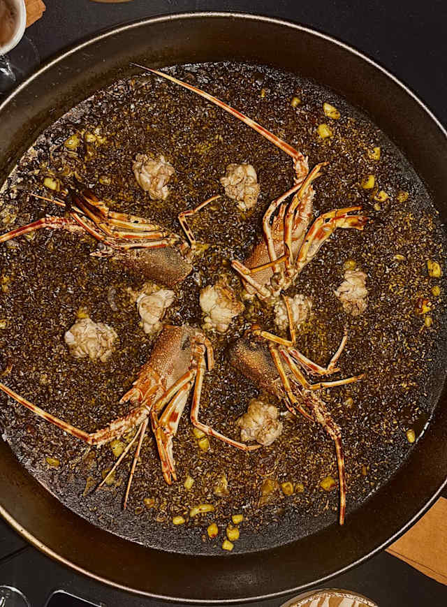 - Min 2 pax, arroz alicantino con sepia fresca, fondo de caldero, algo de su tinta, bisqué de gamba roja.