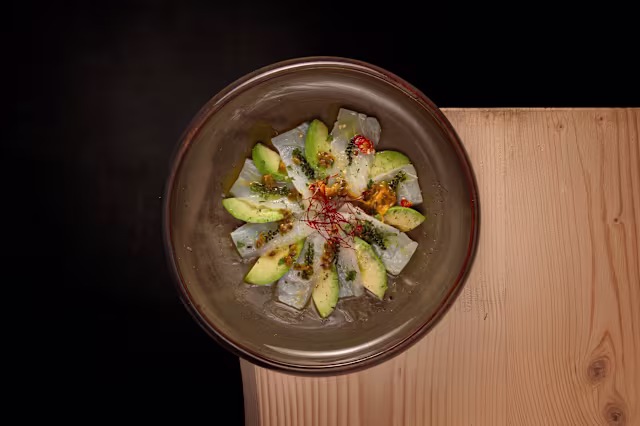 - Salmón gravlax madurado con vinagreta de limón, miso rojo, miel de encina con trufa, pomelo y ponzu.
